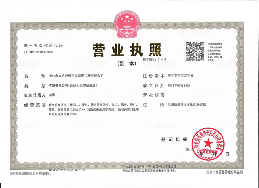 河北鑫豐達(dá)管道防腐保溫工程有限公司坐落于滄州市開發(fā)區(qū),通過ISO9000質(zhì)量管理體系認(rèn)證。本廠擁有工程師4名、技術(shù)人員30名,員工60人,注冊資金5500萬元。專門從事3pe/2pe防腐鋼管、保溫防腐鋼管、防腐螺旋鋼管、水泥砂漿防腐鋼管、等配套工程施工,以及防腐材料研發(fā)制造的大型專業(yè)化企業(yè)。是河北省防腐保溫行業(yè)協(xié)會理事單位。年生產(chǎn)能力500萬平方米。